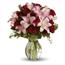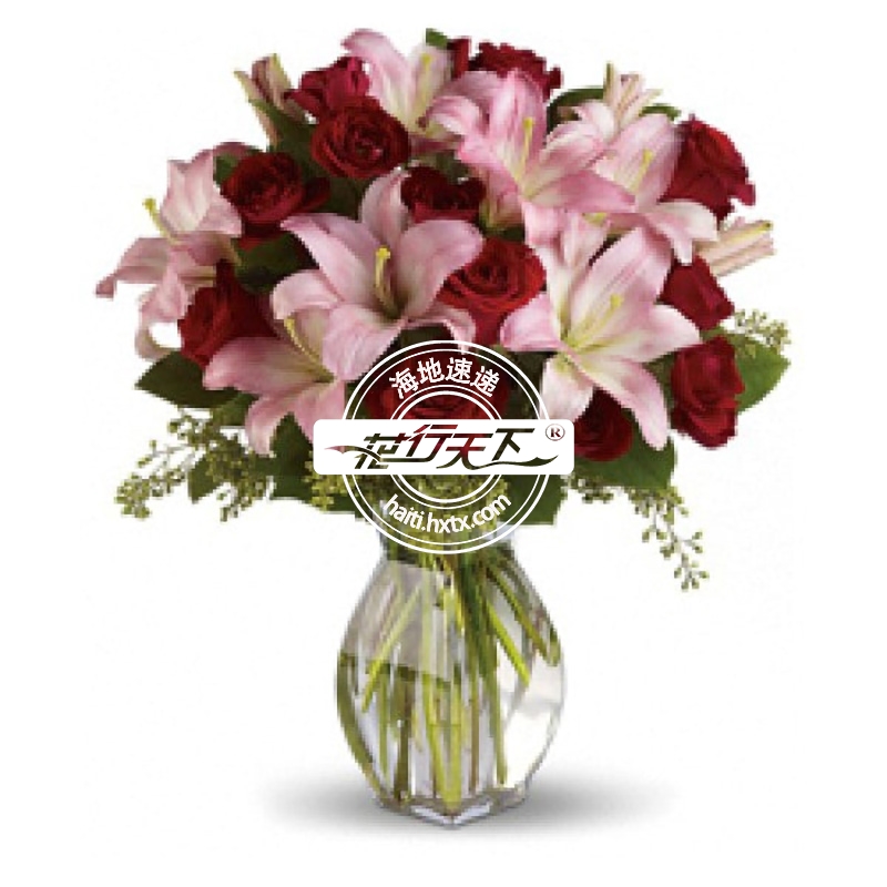 描述: 粉色百合、红色玫瑰、绿叶组成、样式如图。